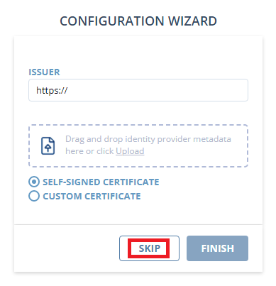 7. Click the Skip button (unless you want to configure SSO (single-sign-on) authentication for the Master Panel, which can also be configured at any time later, and is done in a similar way to configuring SSO authentication for the Management Tool, and must be configured in both the Master Panel and in all the Management Tools (deployments) that it is connected to).