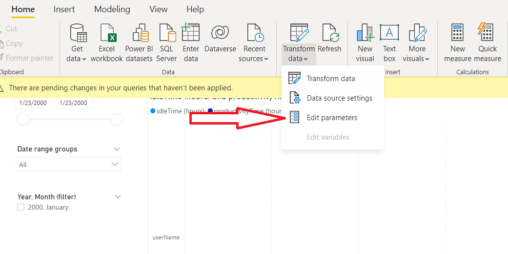 5. In the Power BI report template that was opened, click Transform data > Edit parameters to open the Edit Parameters page.