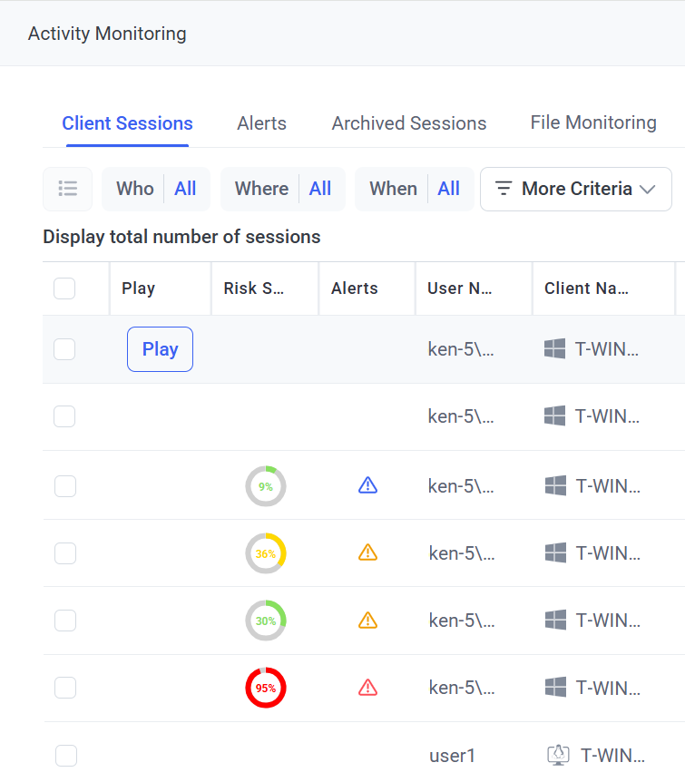 These sessions have a special risk score which is displayed in Risk Score column in the Session List on the Activity Monitoring page.