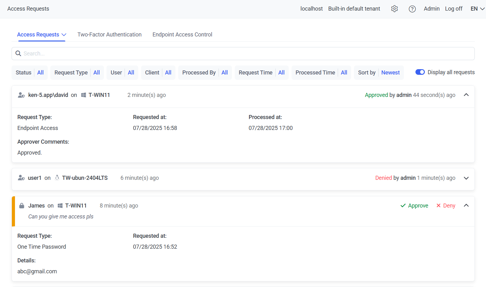 The Display all requests toggle switch slider (in the top right) can be used to also view all old requests i.e. requests that are no longer pending (including Approved, Denied, and Expired requests).