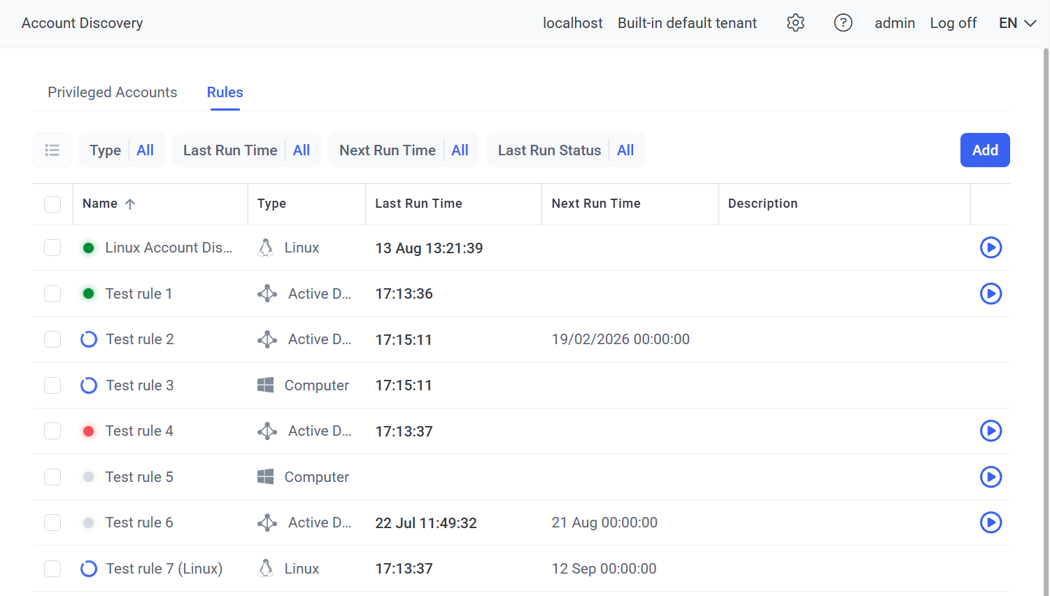 NOTE: If the same account was discovered by multiple rules, only one record (row) is added to the list in the grid, which is for the rule that was last run.