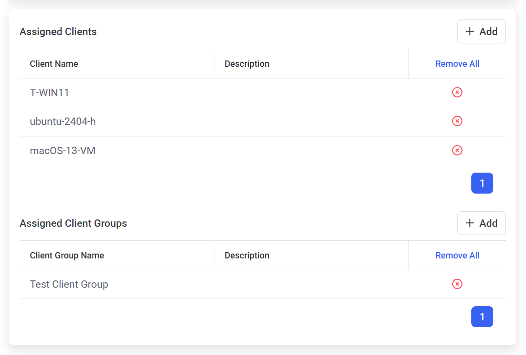 5. In the Assigned Clients and Assign Client Groups sections, select the Clients / Client groups which the alert will be assigned to, by clicking Add.