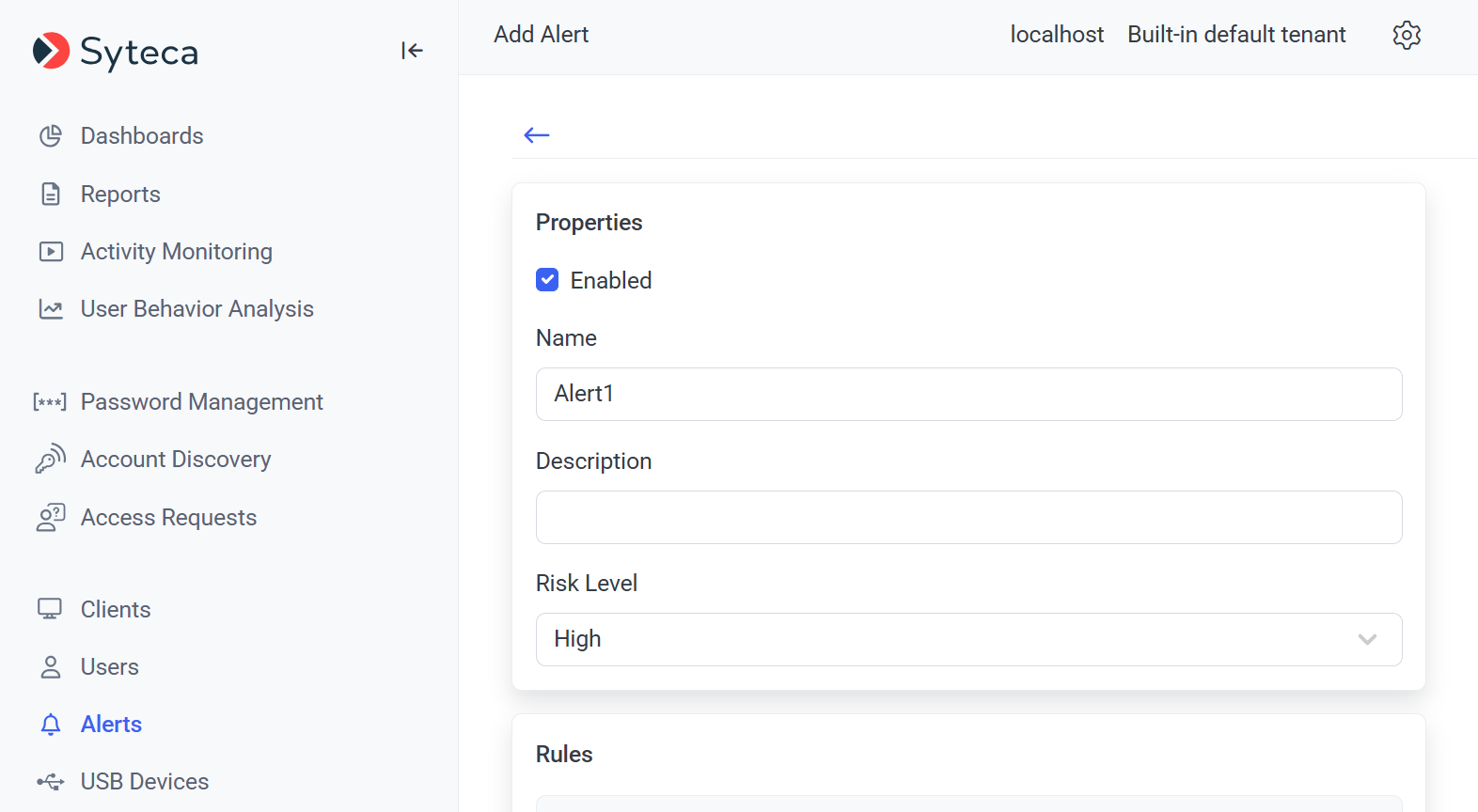 4. In the Rules section, define the rules to be applied to the alert, as follows: