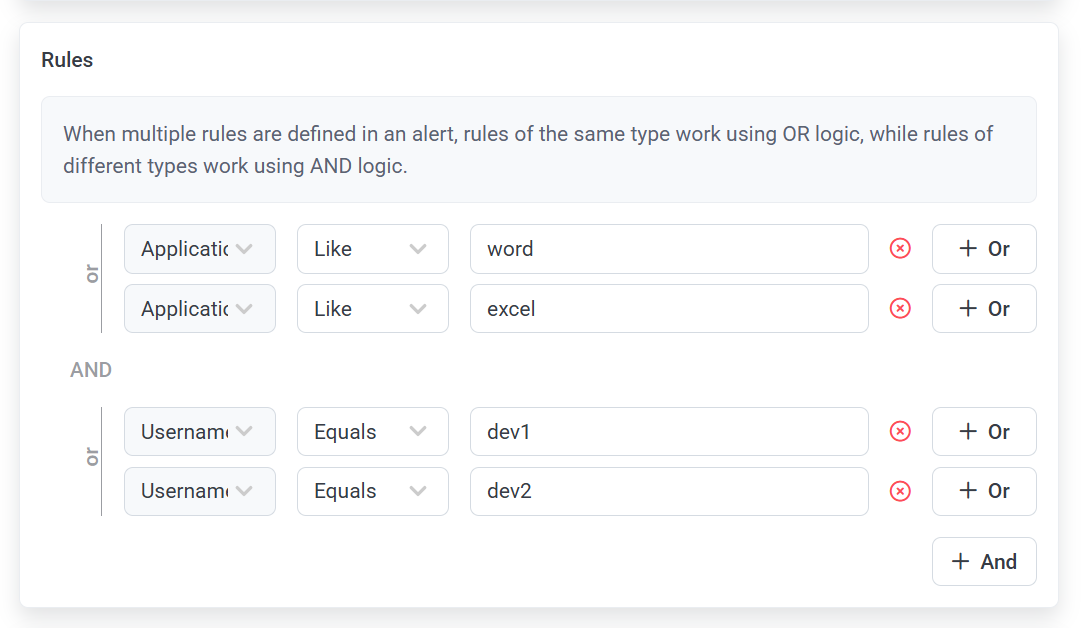NOTE: When multiple rules are defined in an alert, rules of the same type work using OR logic, while rules of different types use AND logic.