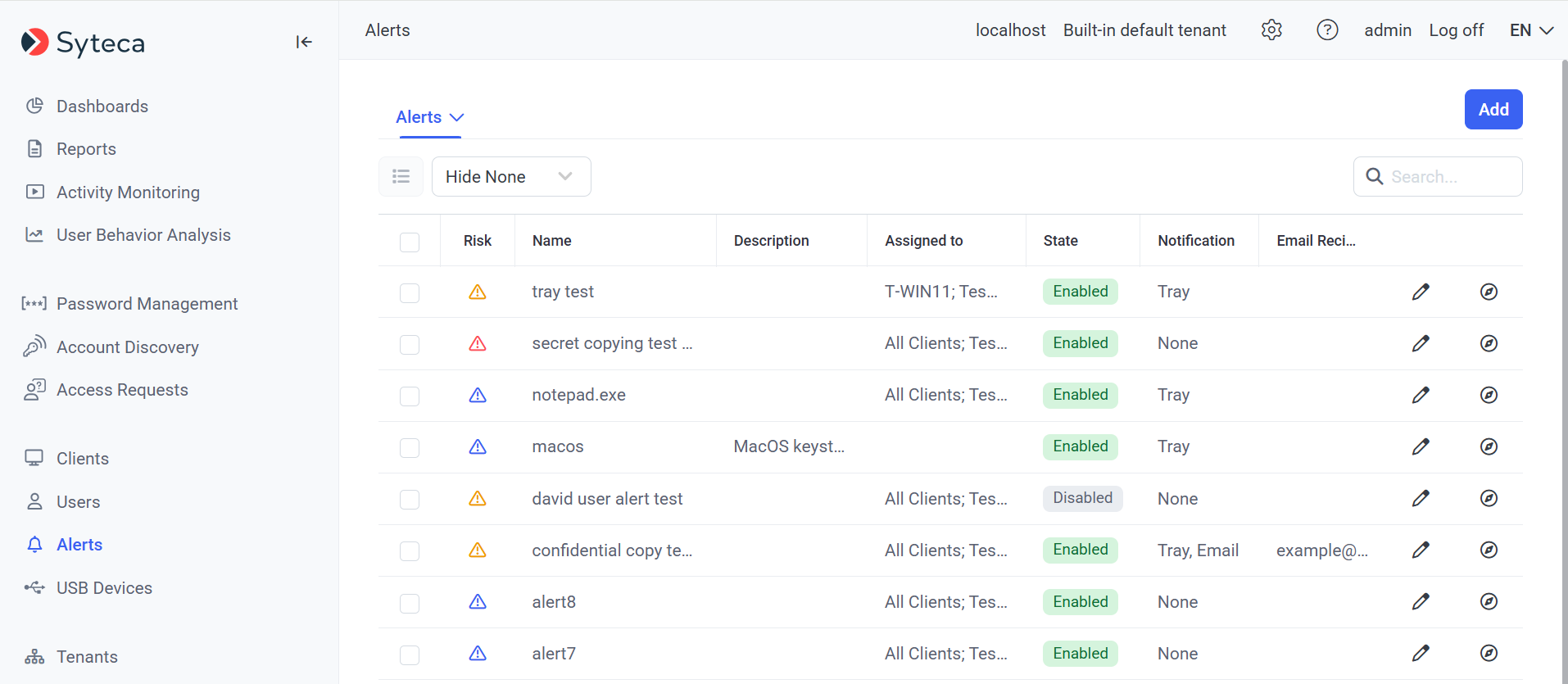2. Click the Alerts navigation link (on the left), and then click the Add button (in the top right) on the Alerts page that opens.