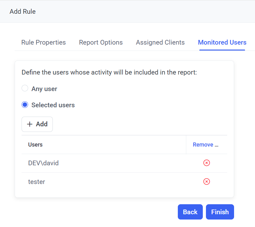 7. On the Monitored Users tab, select the users whose activity will be included in the reports: