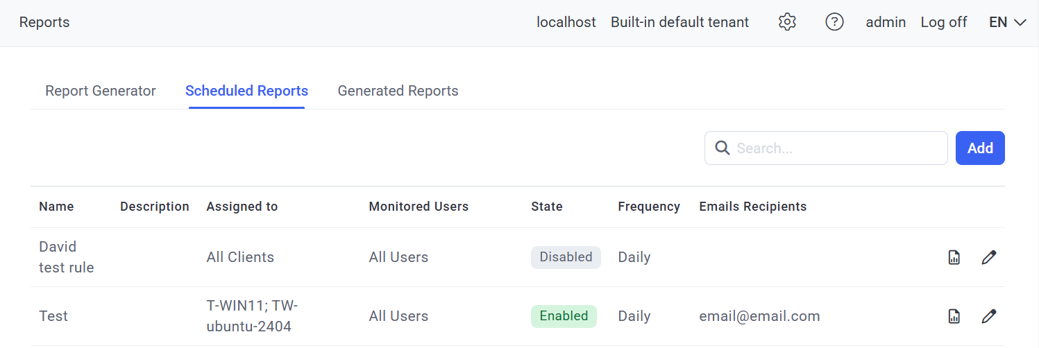 NOTE: Only the user who added (i.e. the owner of) the Scheduled Report rule or the "admin" user, can edit or delete the rule, since the Edit Rule () icon is not displayed (on the Scheduled Reports tab) to other users.