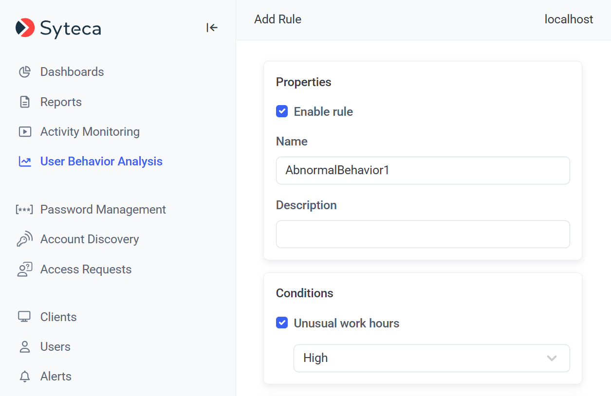 3. On the Rules tab of the User Behavior Analysis page that opens, click the Add button (in the top right of the page).