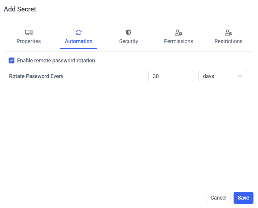 NOTE: After a secret is added, while editing it later, the Rotate Now button is also displayed on the Automation tab, which can be clicked at any time to manually change the account's password at any time.