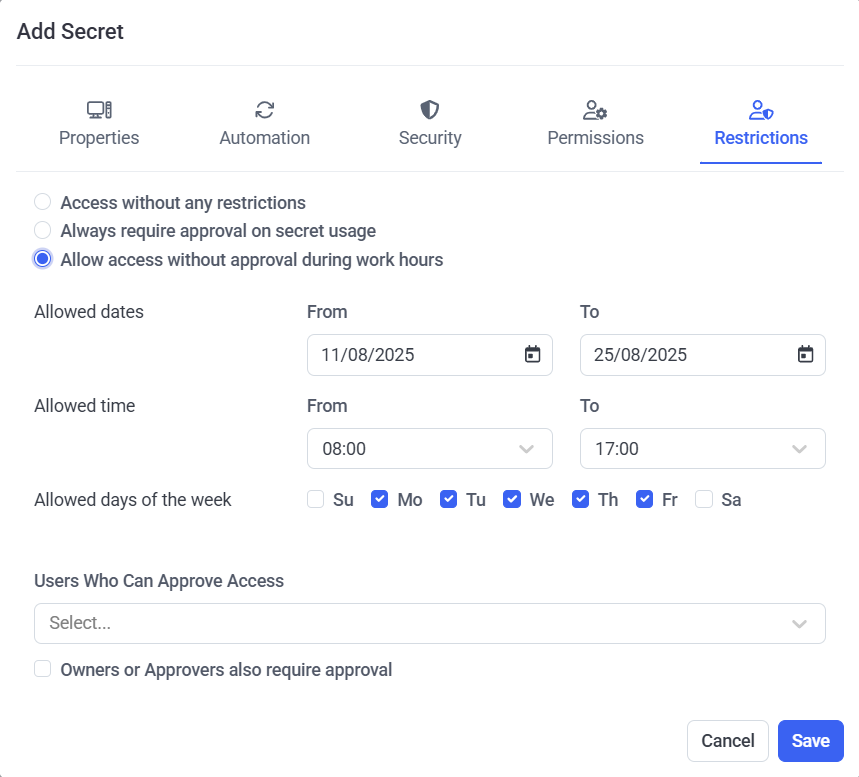 - Allow access without approval during work hours: If this option is selected, specify the date range, work hours, and days of the week when the secret's users will be able to use the secret without approval.