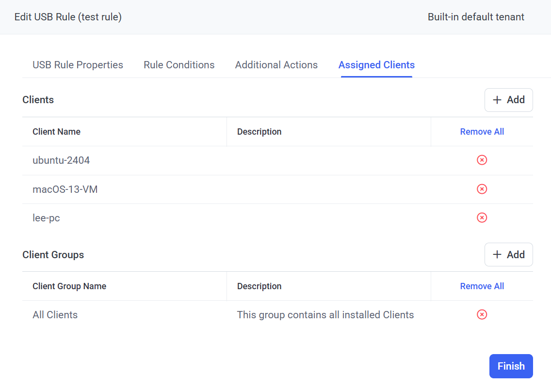 7. On the Assigned Clients tab, click the Add button in the Clients / Client Groups sections, and in the pop-up window that opens, select the Clients / Client groups to which the rule will be applied.