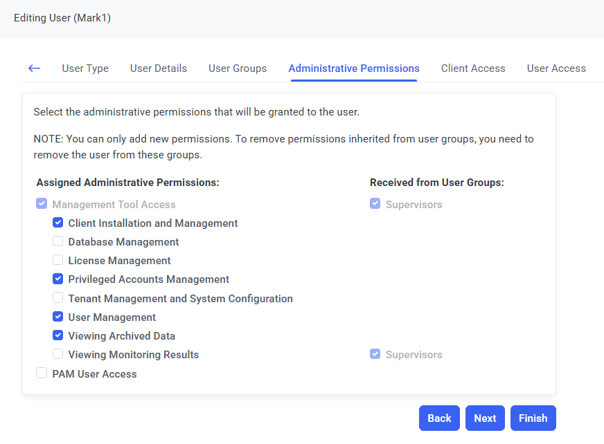 The following administrative permissions for users are available, and can be granted/revoked to/from a user (or user group) while adding/editing the user (or user group):