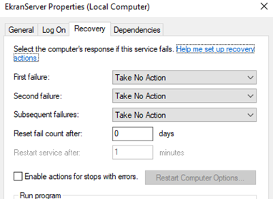 4. Open the EkranServer service properties, and select Take No Action.