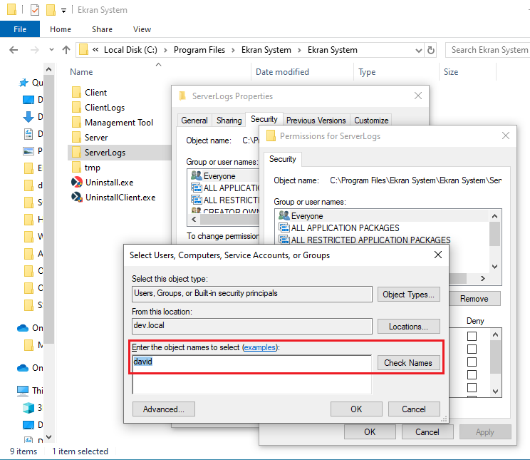 b) In a similar way as above (see 9a), to prevent certain errors related to file access: Allow the non-admin user the Full control permission for the C:\Program Files\Ekran System\Ekran System\Server directory.