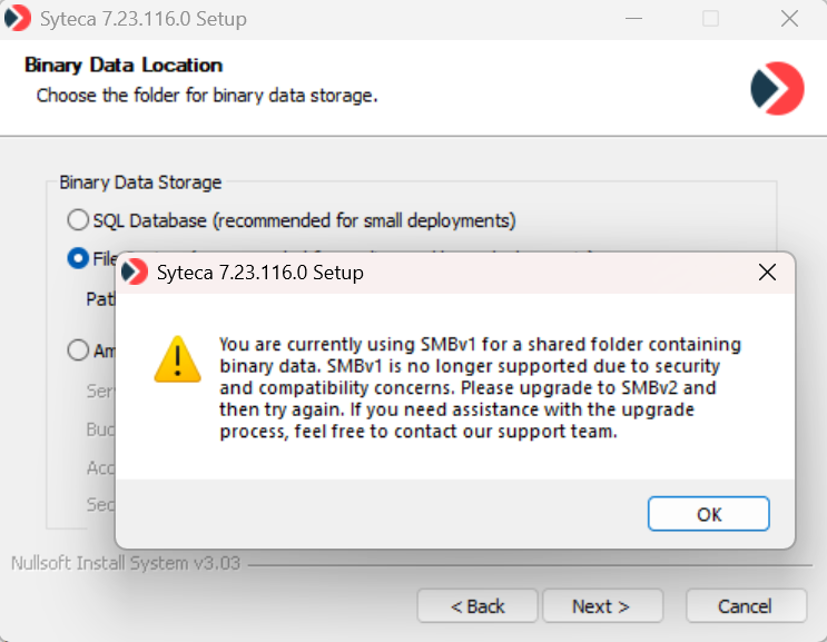 The error “You are currently using SMBv1 for a shared folder containing binary data. SMBv1 is no longer supported due to security and compatibility concerns. Please upgrade to SMBv2 and then try again. If you need assistance with the upgrade process, feel free to contact our support team.” in a popup message when using a shared folder containing binary data, while installing or updating to Syteca Application Server 7.23 (or higher).