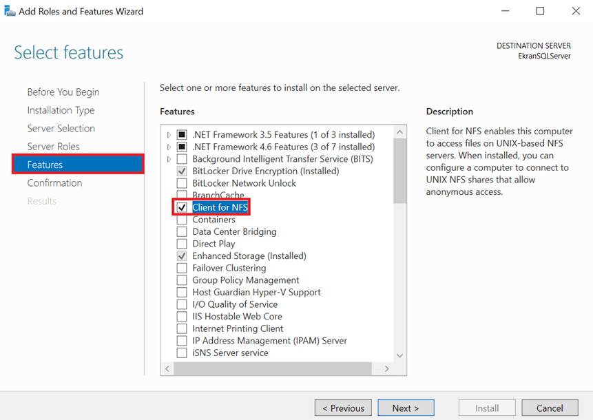 3. In the Add Roles and Features Wizard window that opens, select Features (on the left) to open the Select features page, and then select the Client for NFS feature, and click Next, and then confirm installation.