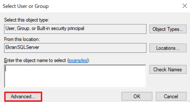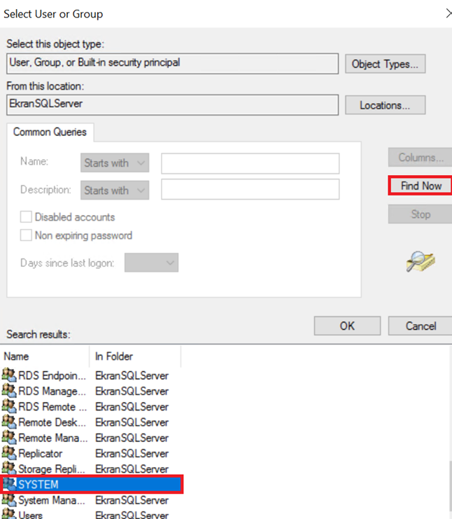 10. Click Find Now, and then select SYSTEM in the list of users and groups displayed.