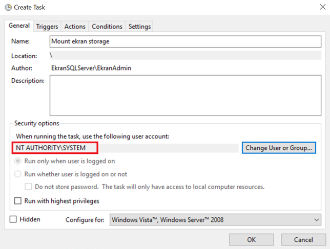 11. Click OK to go back to the Create Task window, and on the General tab, check that the selected user account is displayed in the Security options section.