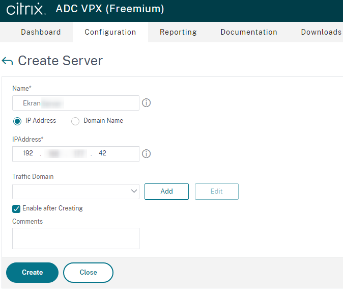 1. Go to Traffic Management > Load Balancing > Servers, and click Add to add a new server to the Citrix ADC.