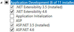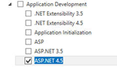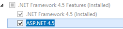 Windows Server 2012 | 1. In the Add Roles and Features Wizard window, on the Server Roles page, make sure that the Web Server (IIS) checkbox is selected, and then click Next. 2. On the Features page, make sure that the following checkboxes are selected: • .NET Framework 4.5 (Installed) and ASP.NET 4.5 3. Click Next. 4. On the Web Server Role IIS page, click Next. 5. On the Role Services page, select the ASP.NET 4.5 checkbox (under Application Development).