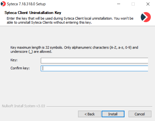 12. On the Syteca Client Uninstallation Key page, enter a key that will be used for uninstalling the Client locally, and click Next.