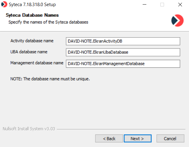 9. On the Syteca Database Names page, define unique names to be used for the Syteca databases.