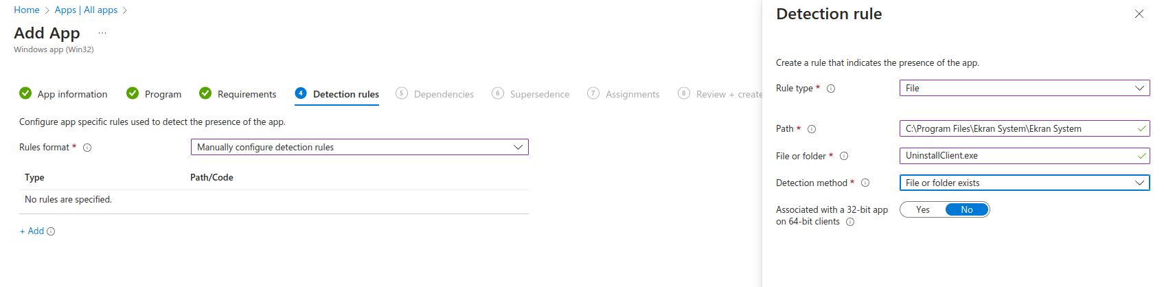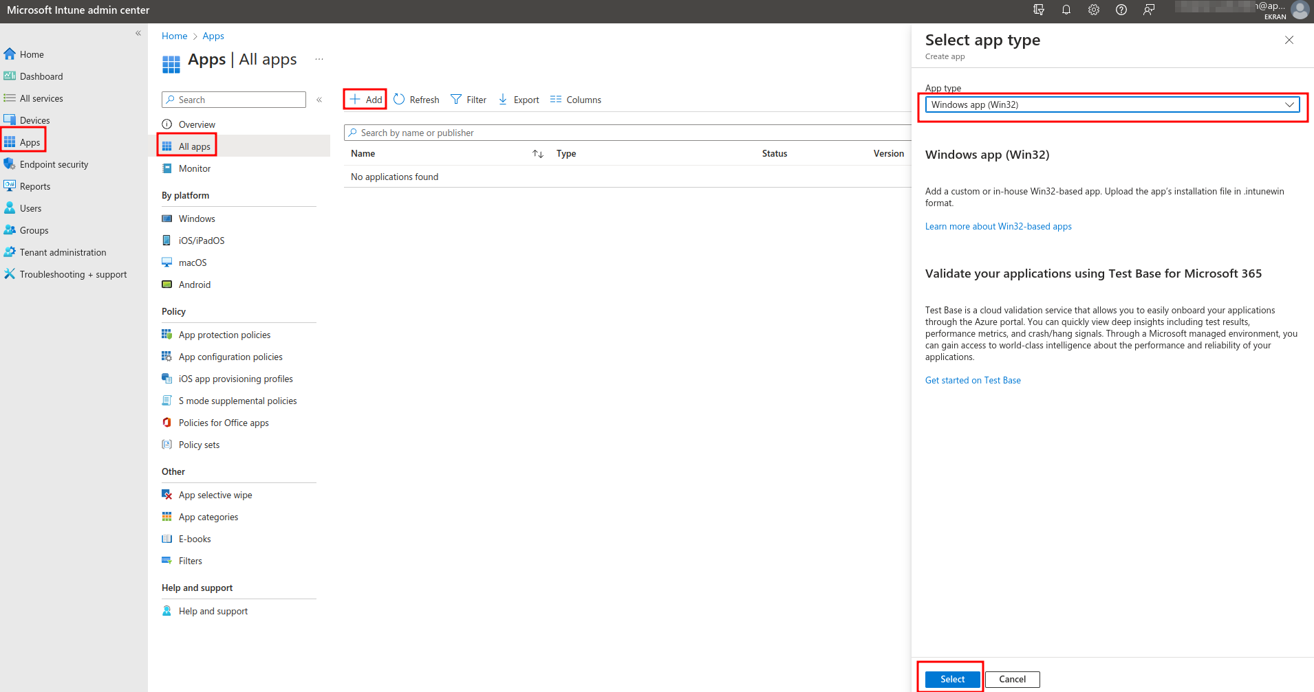 3. Click + Add, and then select Windows app (Win32) in the App type drop-down menu in the Select app type pane (on the right).