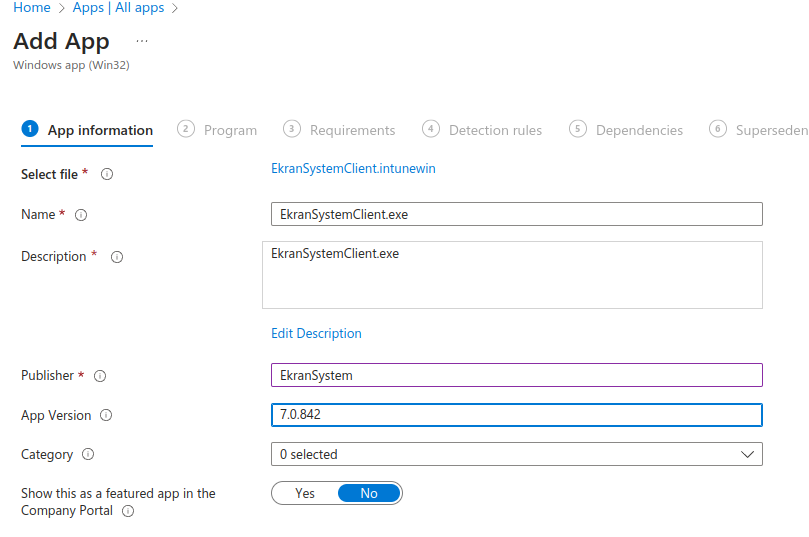 5. On the App information tab, enter the required details about the application (in the Name, Description, and Publisher fields), and then click Next.