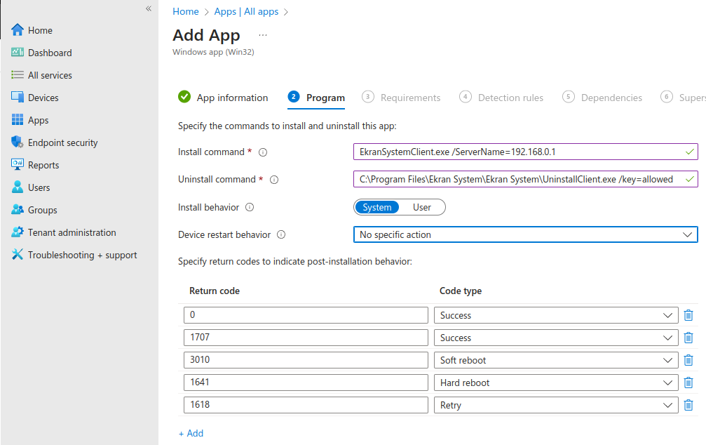 • Uninstall command: C:\Program Files\Ekran System\Ekran System\UninstallClient.exe /key=<uninstallation_key> (where "<uninstallation key>" needs to be replaced by the actual Uninstallation key).