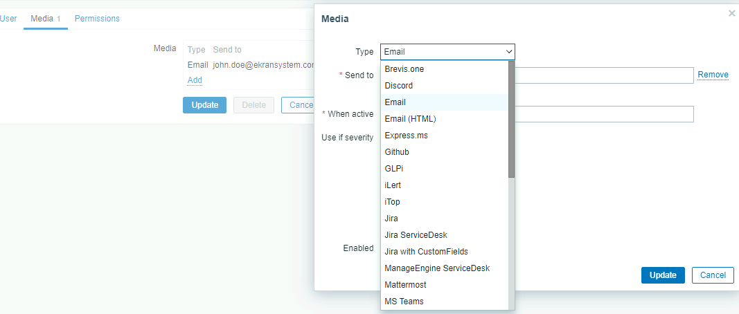 5. Zabbix can send various types of notifications (e.g. SMS, Email, Telegram, Slack, etc.) which next need to be added to all the users and/or user groups defined above.