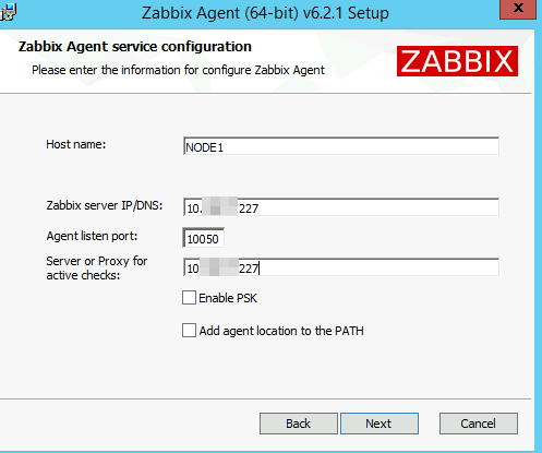 • Agent listen port: Enter the port number of the machine on which the Zabbix server is installed.