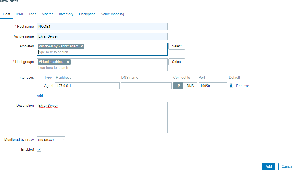 • Templates: Select a template to allow different resources, services, and hardware and software components to be monitored by the Zabbix agent (in this case, the Windows by Zabbix agent template has been used, as shown in the screenshot below).