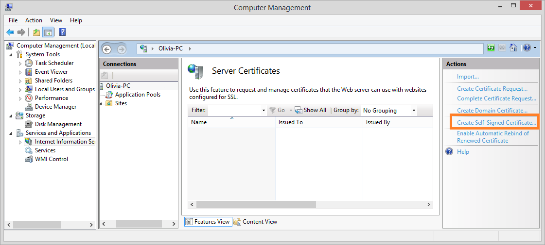 4. In the Actions pane on the right, click Create Self-Signed Certificate.
