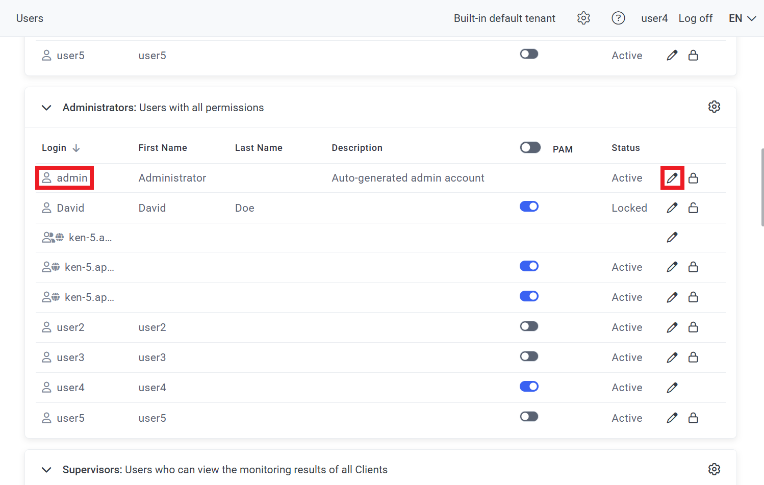 3. On the Users page that opens, edit the default “admin” user of the system by clicking on the Edit User (
