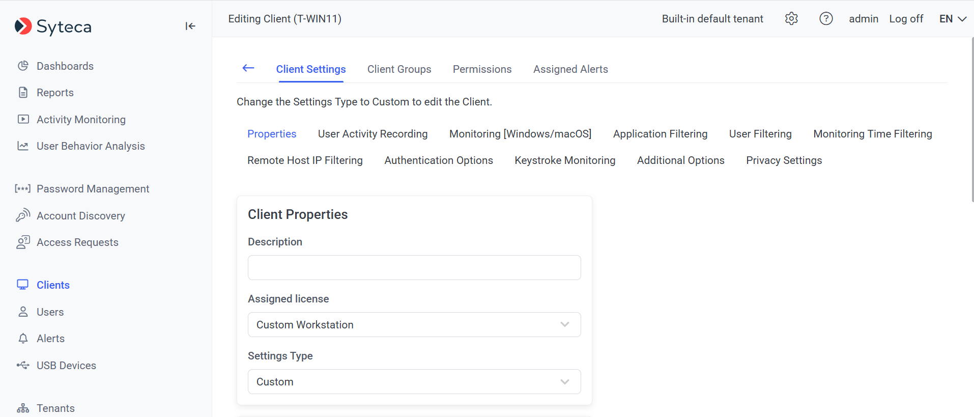 4. On the Editing Client page that opens, on the Properties tab, do the following: