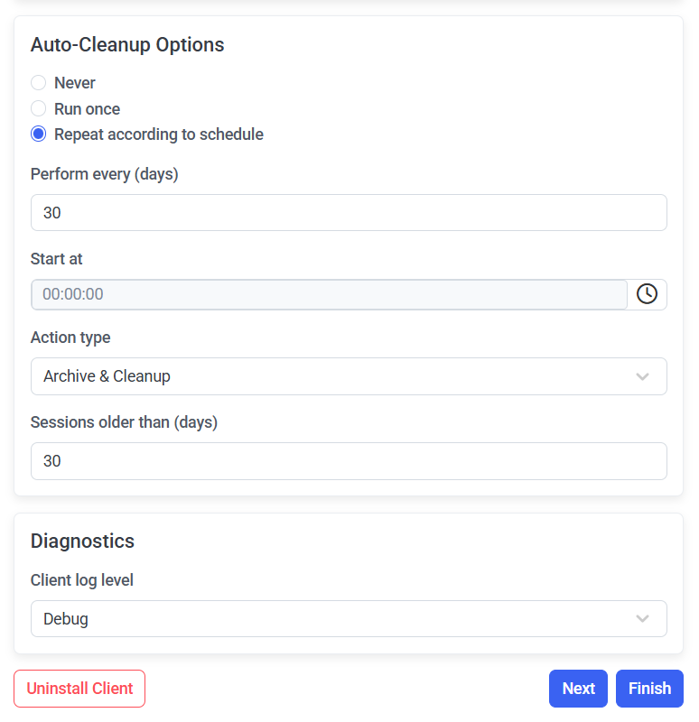 - Run once: A one-time cleanup operation will be performed by clicking the Finish button on the Editing Client page.