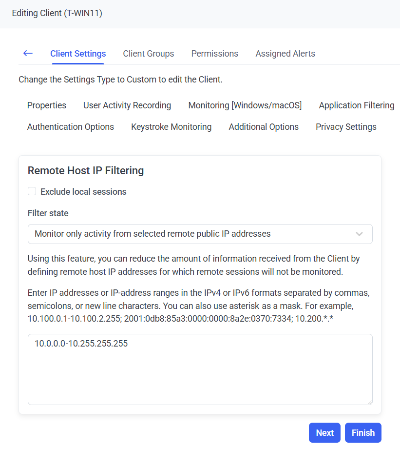10. On the Remote Host IP Filtering tab, define the Remote Host IP Filtering parameter for the Client.