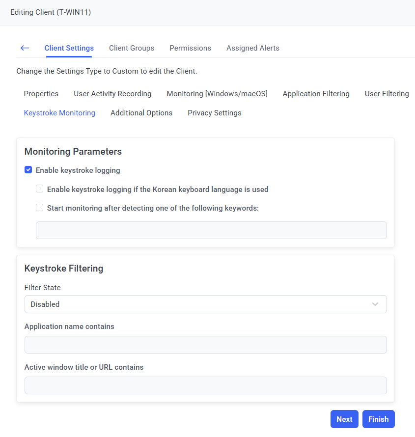 • In the Keystroke Filtering section, define the Keystroke Filtering parameter for the Client.