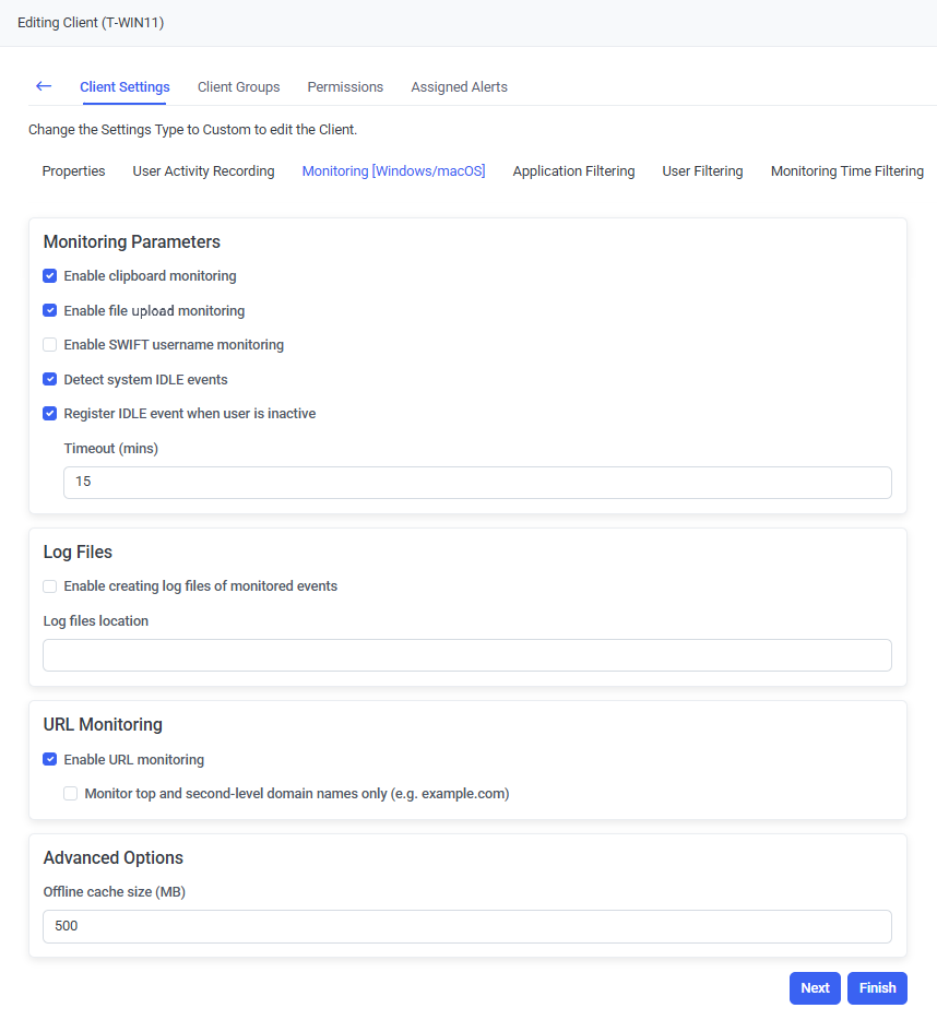 - Select the Enable creating log files of monitored events checkbox to enable the creation of monitoring logs on the Client computer and define the location of the log files.