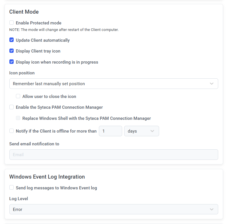 - Select the Send log messages to Windows Event log checkbox and select the severity level (Error, Warning, or Information) of the log entries in the Log Level drop-down list if you want to save Syteca events, such as errors, warnings, and informational messages to the Windows Event log on the Client Computer.