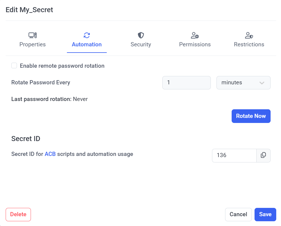 | secretId | Yes | The identifier (number) of the secret, whose properties need to be received. NOTE: The Secret ID can be copied from the Management Tool, while editing a secret on the Automation tab (see above). | |||||