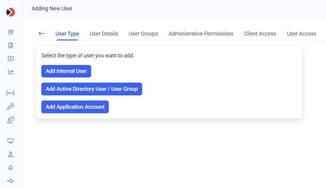To be able to use the Syteca ACB API, you need to first create a user account of any type (except an Active Directory user group) on the Users page, by clicking the Add User button (in the top right of the page (where the user must have the administrative User Management permissions to do this).