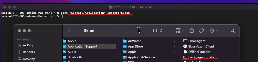 2. Use the following command to open the folder where you can find the pack_agent_data.sh tool, which can then be used to create the Client logs locally in: open /Library/Application\ Support/ Ekran