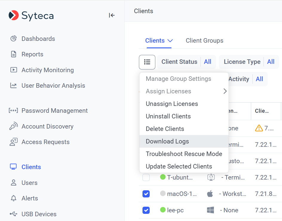 To download the Client Log files from the Management Tool, open the Clients page, and select the checkboxes next to the required Clients, and then click the Bulk Action () button, and select Download Logs in the drop-down list that opens.