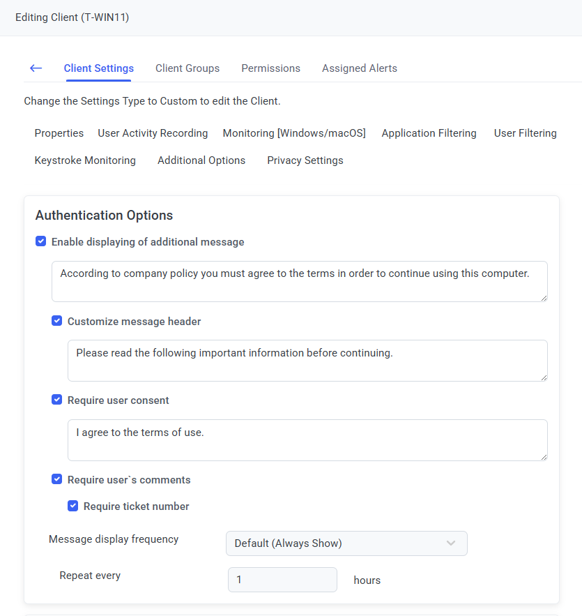 To enable the option to display of an additional message on login (and configure the options in it) while editing a Windows Client (or Client group), do the following: