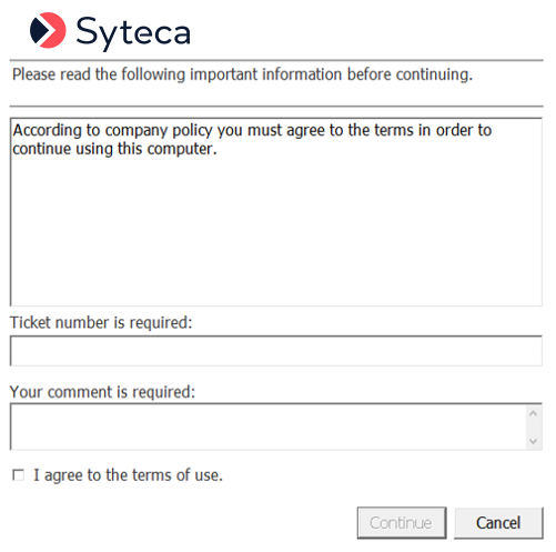 • Require user's comments: Select this checkbox to also force the user to enter a comment in to the additional pop-up message window, so as to inform Syteca administrators of the user's activity. Only after the user enters a comment into the Your comment is required field in to the additional pop-up message window displayed on login, will they be allowed to access the Client computer by clicking the Continue button.