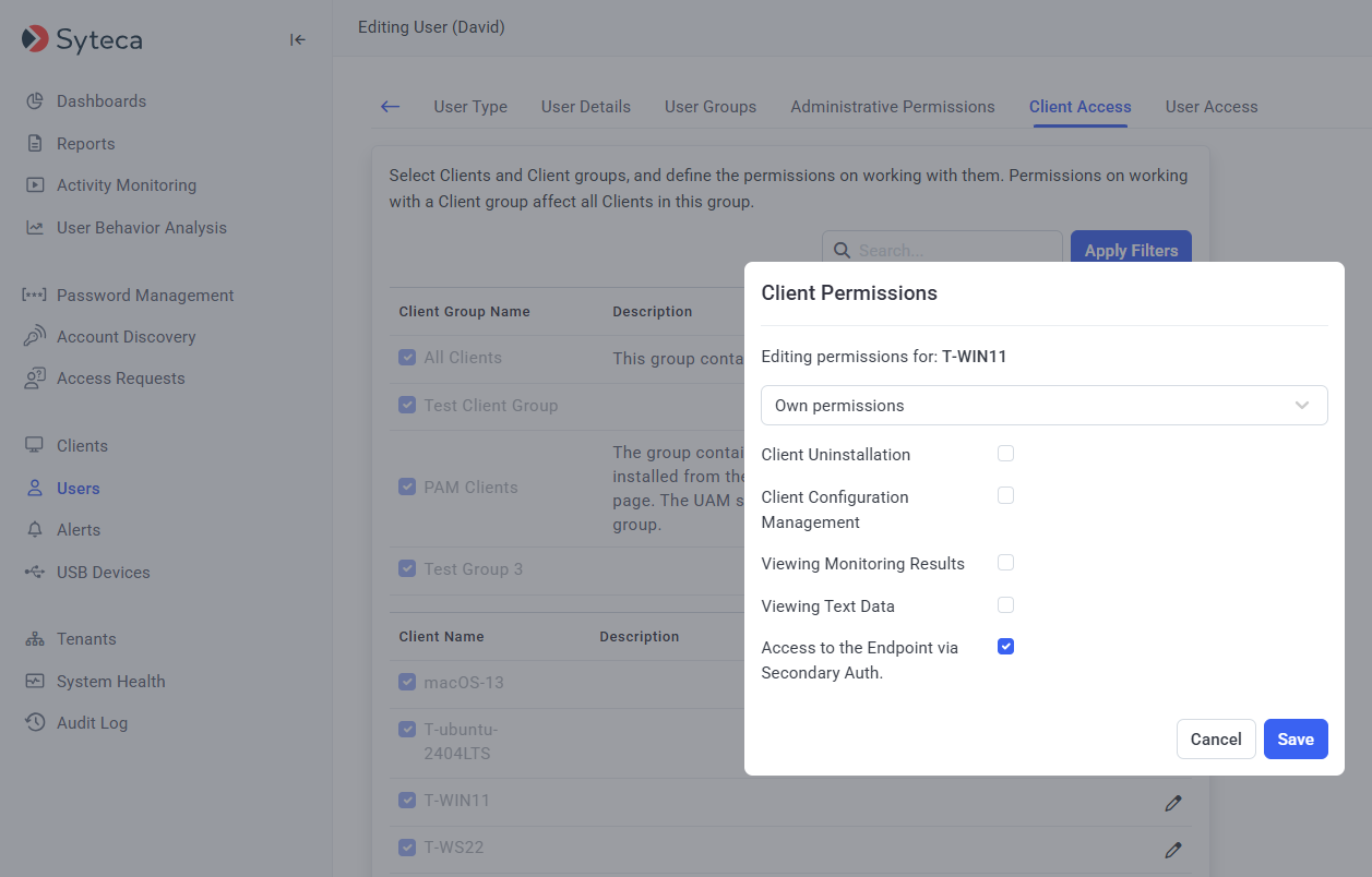 To grant a Syteca user permission to log in to a Client computer with secondary user authentication enabled, do the following: