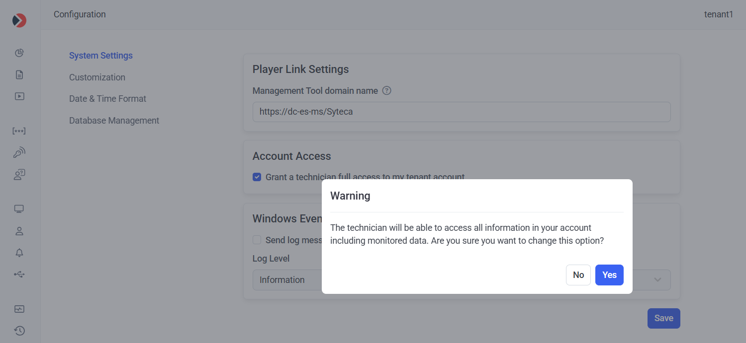 3. On the Configuration page that opens, on the System Settings tab, select the Grant a technician full access to my tenant account checkbox (in the Account Access section at the top).