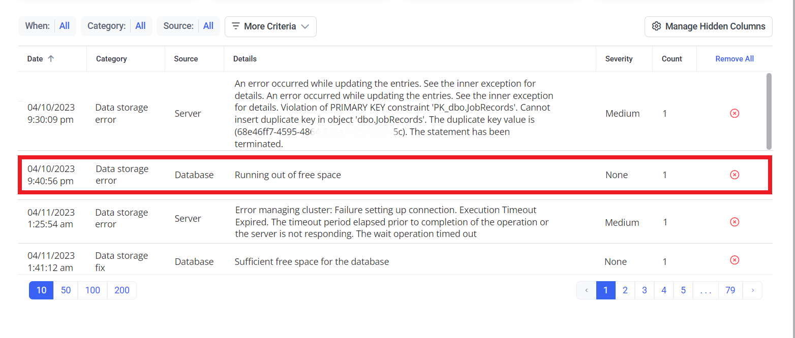 If the location where the Syteca data is stored has an average of less than 2.5 GB of free space available for each Client machine, the notification “Running out of free space“ will start being added to the System Health Transaction log regularly. e.g. if there are 10 Clients installed on your system, then there needs to be a total of more than 25 GB of free space in the storage location, so that these notifications will not occur.