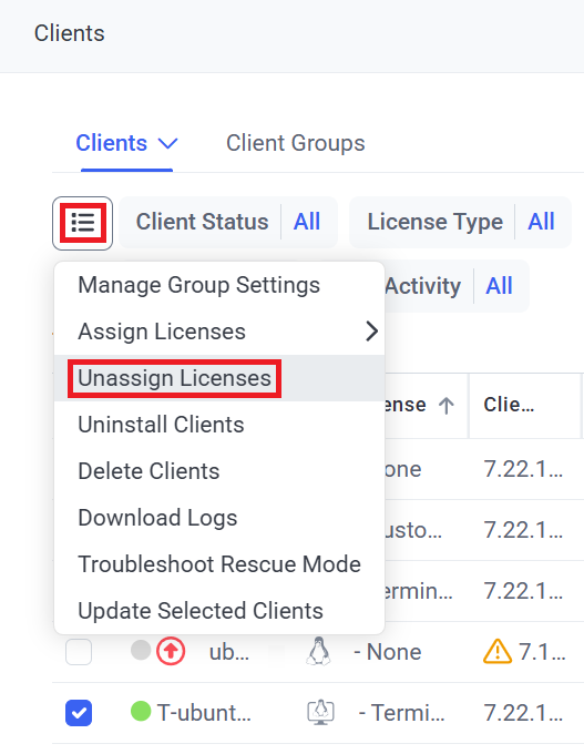 1. Unassign the license from the Linux Client (on the Clients page) to make sure there are no active (i.e. Live) sessions.